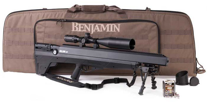 Benjamin Bulldog .357 cal Kit, Includes CenterPoint 4-16x56 scope, lens covers and rings; embroidered tactical rifle case with padding, large exterior pocket and removable padded shoulder strap; rifle sling; bipod with telescoping legs; Swab-Its; 6 Nosler Ballistic Tip eXtreme 145-grain bullets; and lube $1249.00.