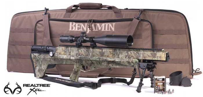 Benjamin Bulldog Bullpup, Real Tree Xtra .357 cal Kit, Includes CenterPoint 4-16x56 scope, lens covers and rings; embroidered tactical rifle case with padding, large exterior pocket and removable padded shoulder strap; rifle sling; bipod with telescoping legs; Swab-Its; 6 Nosler Ballistic Tip eXtreme 145-grain bullets; and lube $1349.00.