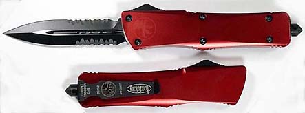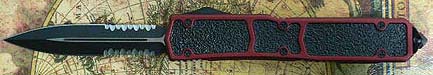 Automatic out-the-front knife. Handle is red anodized T-6 aluminum.