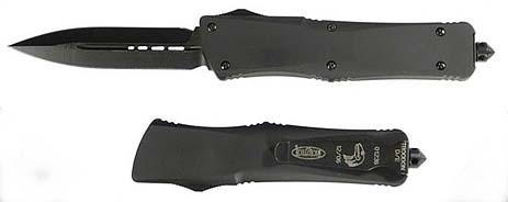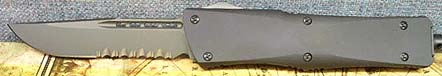 Large automatic out-the-front tactical knife. Handle is black