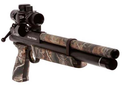 Benjamin Marauder Woods Walker Air Pistol-Weight: 2.70 lbs-Barrel Length:12.00"-Overall Length: 18.00"-Capacity: 8 round(s)-Barrel: Rifled- Scopeable: 11mm dovetail-Trigger adj.: Two-stage adjustable-Apprx. Trigger Pull: 1.53 lbs-Suggested for: Small game hunting/plinking-Action: Bolt-action-Powerplant: Pre-charged pneumatic-Safety: Manual-Repeater: Repeater-Body: Pistol-Fixed/adj. power: Fixed-Includes shoulder stock and Multi-TAC Quick Aim Sight- .22 cal 700 ft/sec-8-rd circular mag with auto-indexing-11mm dovetail-Integral shroud makes this a VERY quiet gun-12" choked barrel delivers superior accuracy-Raised aluminum breech for easier loading of the clip-2-stage adjustable match trigger...and the trigger is heat-treated metal! 1.53 lbs. trigger-pull-Uses 2,900 psi compressed air-Built-in pressure gauge-Air tank has a quick-disconnect male Foster fitting-65cc (4 cu in) reservoir-Ideal for hunting small quarry up to 33 yds away-Marauder pistol clips are not interchangeable with the Marauder rifle clips...and vice versa-Realtree AP camo grip, forearm and detachable shoulder stock-Includes one mag, shoulder stock extension and CenterPoint Optics Multi-TAC Quick Aim Sight (does not include a degassing tool)-Unlike many of the other Benjamin PCP guns, the Marauder pistol cannot be filled with CO2. Use only high-pressure air. An ideal hunting gun! Lightweight, easy to carry in the woods, and powerful enough to reliably and humanely take small game at close distances. Benjamin Marauder Woods Walker Air Pistol .22 cal $479.00