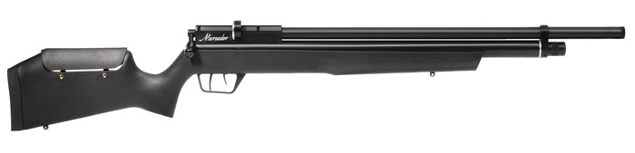 Benjamin Marauder PCP Air Rifle 10-shot repeater with auto-indexing feature (.25 cal is an 8-shot repeater) Uses compressed air up to 3,000 psi Adjustment for different velocities Sound suppressed shroud Choked barrel accuracy 2-stage adjustable match trigger 11mm dovetail Ambidextrous synthetic stock with vertically adjustable comb Built-in air pressure gauge 215cc air reservoir Quick-disconnect Foster fitting Includes one magazine, sling swivel studs & degassing tool Benjamin Marauder with adjustable cheek pad .177 cal1100 ft/sec $519.00