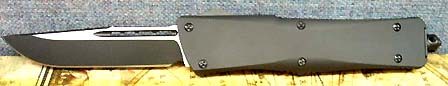 Large automatic out-the-front tactical knife. Handle is black