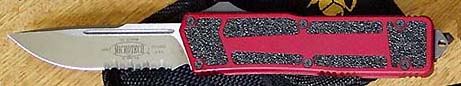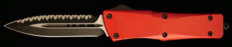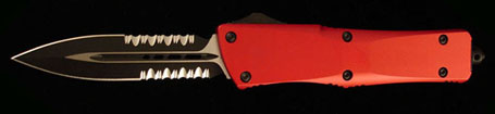 Automatic out-the-front knife. Handle is red anodized T-6 aluminum.